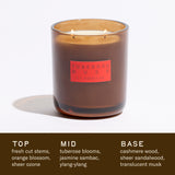 Top notes of fresh cut stems, orange blossom, and ozone are blended with blooming tuberose, jasmine sambac, and ylang ylang, balanced by cashmere wood, sheer sandalwood, and translucent musk for lovers of Sandalwood Rose and Saltwater Jasmine.